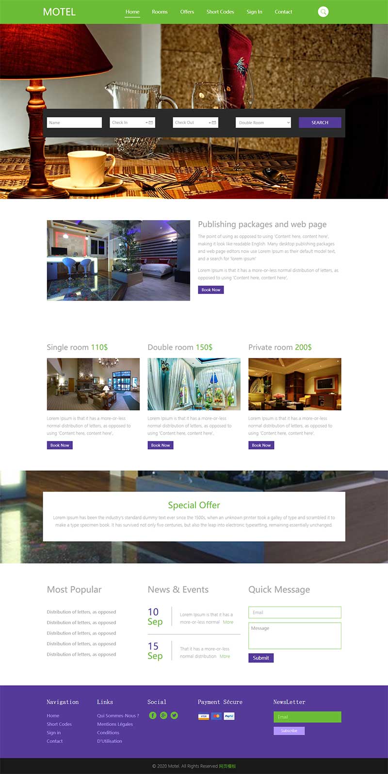 这款经典实用的酒店展示及预订网站模板,在首页就包含了酒店预订日期、房型、入住和离开选择,符合现在人的方便快捷,是酒店网站必备功能。觉得不错的小伙伴直接下载使用,模板可自由编辑。